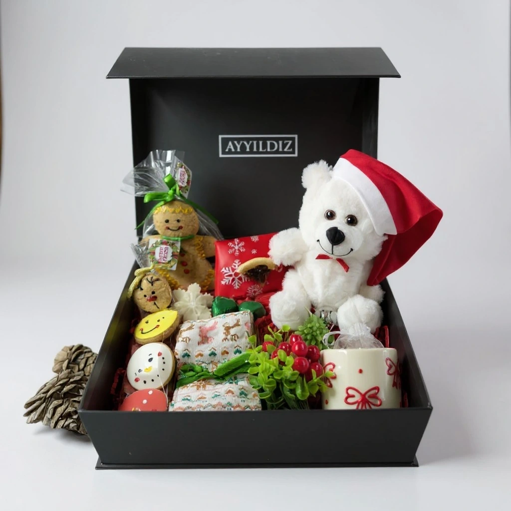 Yılbaşı temasına uygun olarak tasarlanmış kutu, sevdiklerinize sıcak bir yeni yıl hediyesi sunmanın en şık yollarından biridir. İçeriğindeki enfes çikolatalar ile tatlı bir sürpriz yaparken, peluş oyuncak da sevginizi en yumuşak şekilde ifade eder.